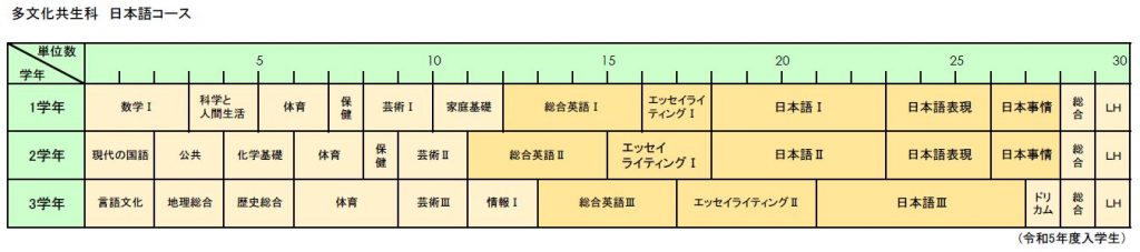 1年次には日本語と英語を中心に学び,3年次にかけて(日本語能力向上につれて)他の必修科目を学んでいきます。