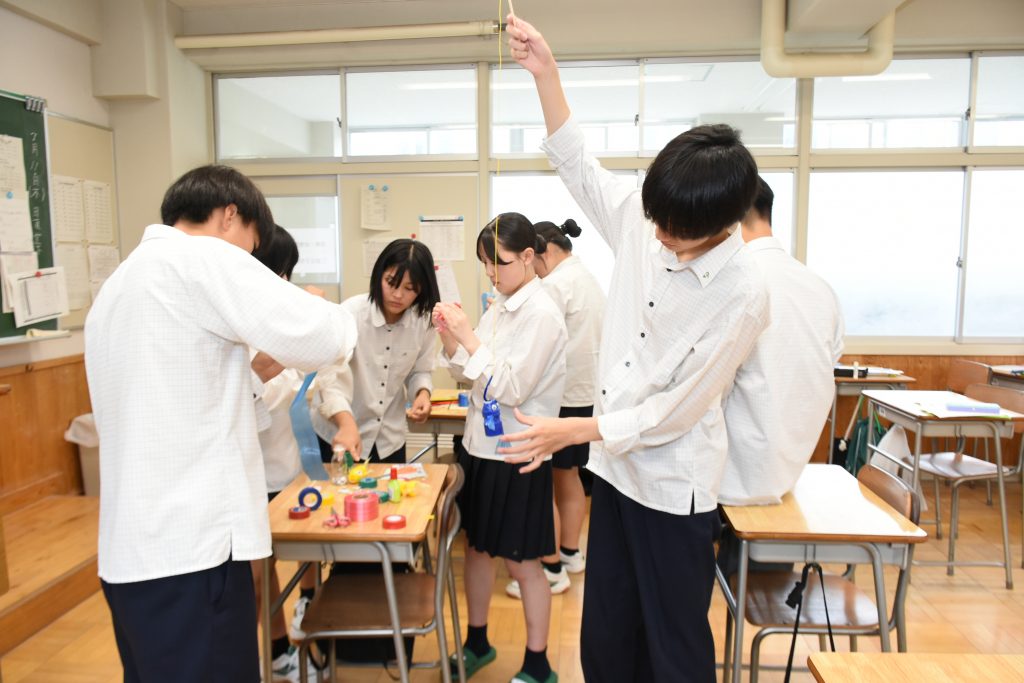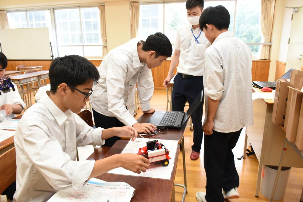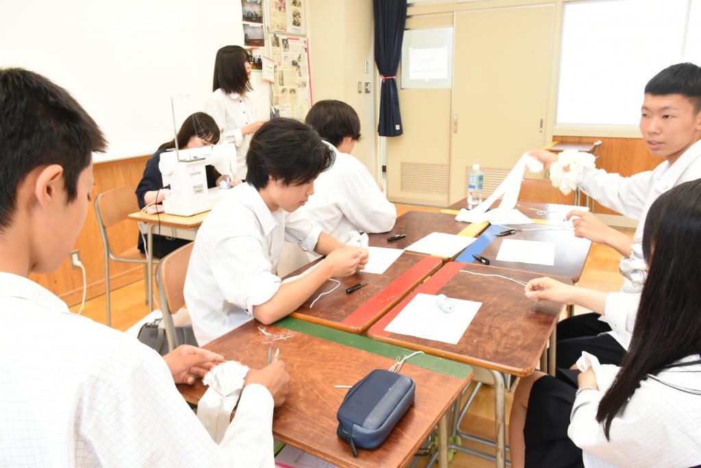 ファッションの講座を受けた生徒は、髪留めの「シュシュ」作りに挑戦。友人と相談しながら布を縫い合わせ、シュシュを完成させました。保育の講座では、プラスチックボトルなどを使った魚釣りゲームを手作り。プログラミング講座ではロボット操作を体験し、思い通りに動かせると「すごい」「うわー」と歓声を上げていました。 自分の将来について考える貴重な機会をいただき、ありがとうございました。