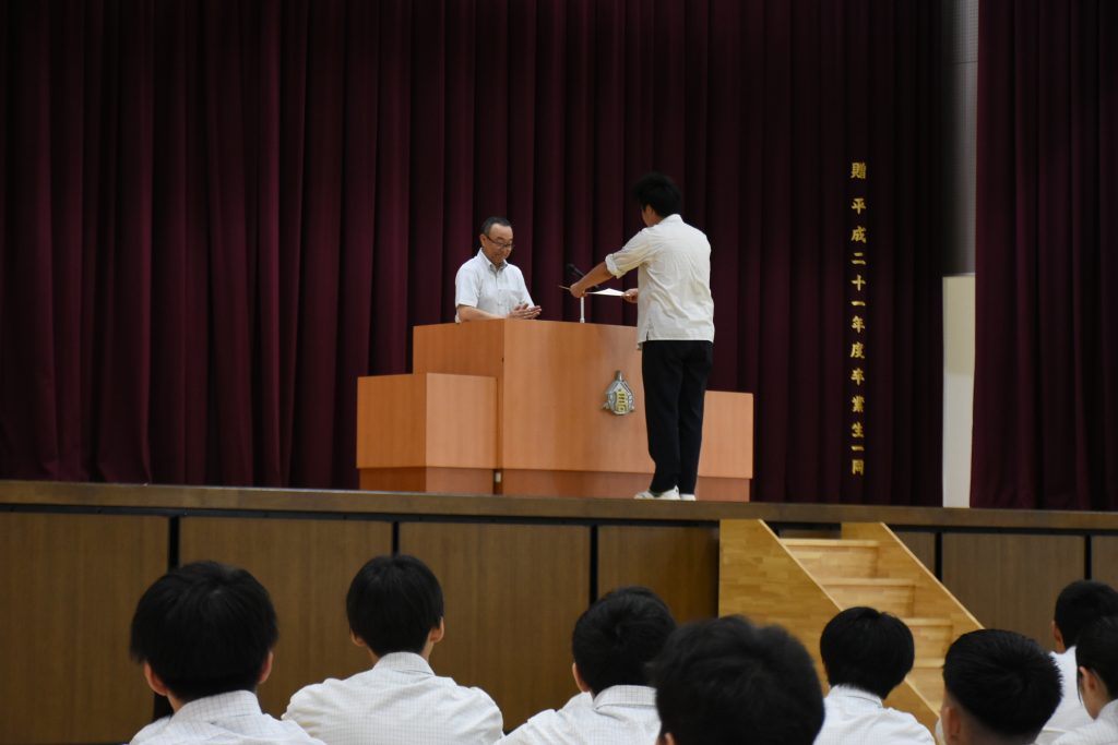 7月19日(金)、1学期の終業式と離任式が行われました。校長先生は式辞で、「努力」をテーマにした書道部の作品に触れ、「目標に向かって努力する道のりに価値がある。夏休みはそれぞれ努力を惜しまずに、充実した日々を過ごしてください」と話しました。