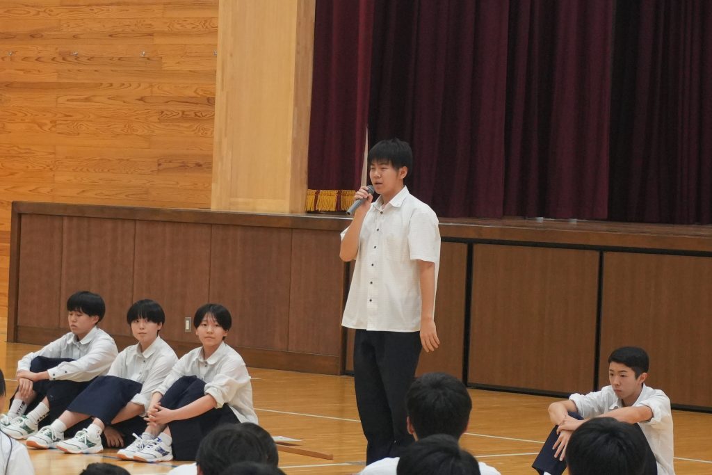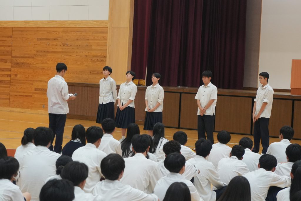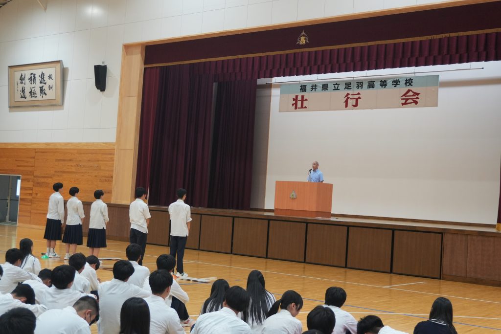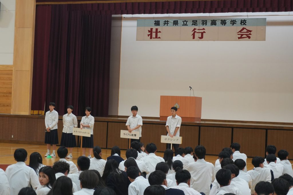 9月24日(水)、国民スポーツ大会の壮行会が行われました。本校からは5名の生徒が福井県代表としてそれぞれバスケットボール・ライフル射撃・ボクシング競技に参加します。選手たちは大会への意気込みを語った後、松島校長先生や生徒会長から激励の言葉をいただきました。大会での活躍を心から応援しています。