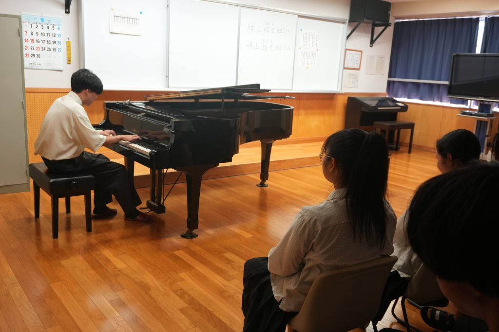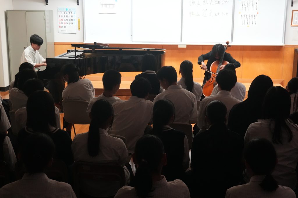9月18日(木)と19日(金),1年生の芸術の授業で「音楽鑑賞会」が行われました。勝山赳史さんによるチェロソロで始まり,勝山紘史さんのピアノソロ,そして最後はお二人の息の合ったデュオで,合計7曲を楽しみました。生徒の皆さんは「めちゃめちゃ良かった!」「即興なのに息がぴったりですごい!」など,感動した様子でした。 ご演奏いただきました勝山紘史さん,勝山赳史さん,素敵な演奏をありがとうございました。