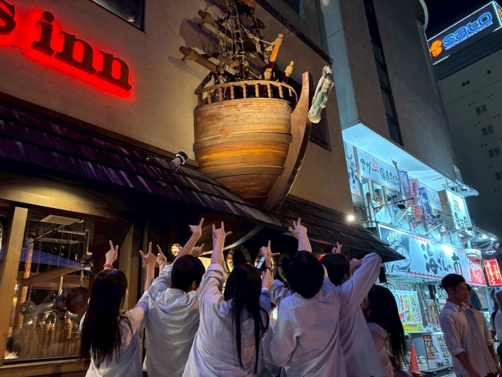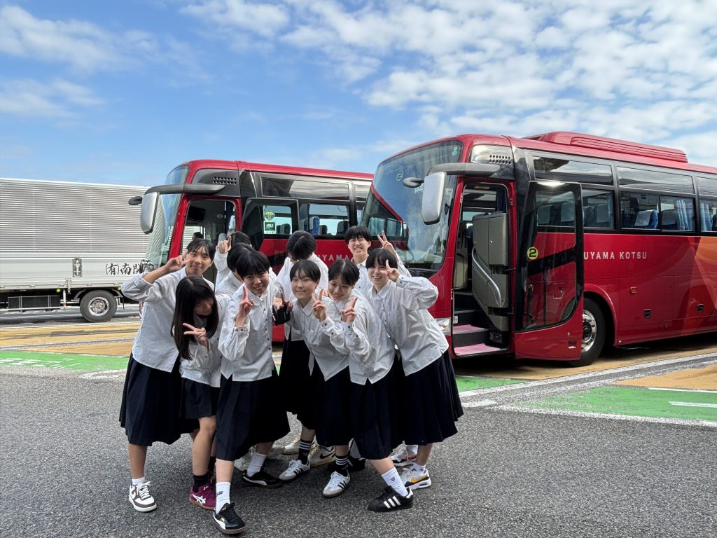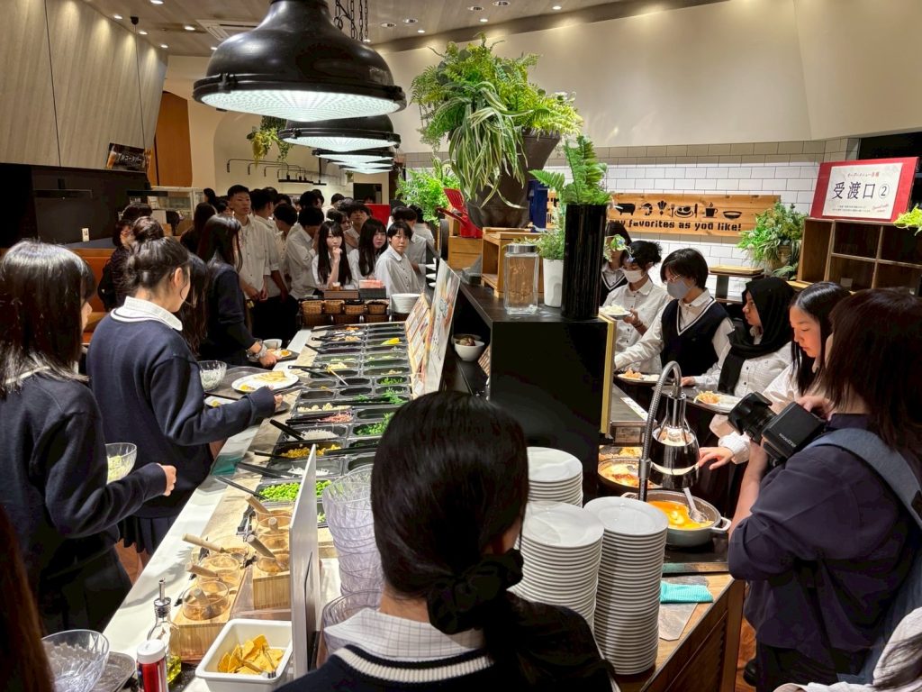 10/14(火)、修学旅行1日目が始まりました。クラスごとに分かれてバスで出発しました。長時間の移動もクラスメイトと楽しくお話をしたり、映画を見たりして時間を過ごしました。途中でパーキングエリアに寄って休憩した後、ついに最初の目的地であるグランブッフェ伊丹に到着しました。たくさんの料理を食べ、午後に向けてエネルギーを蓄えました。