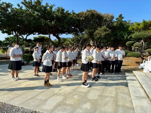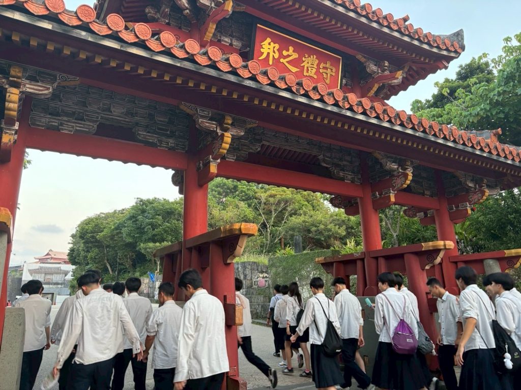 沖縄到着後はガイドさんの案内で首里城へ行きました。集合写真を撮った後、生徒たちはクラスメイトと一緒に周辺の散策を楽しみました。