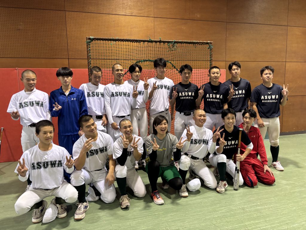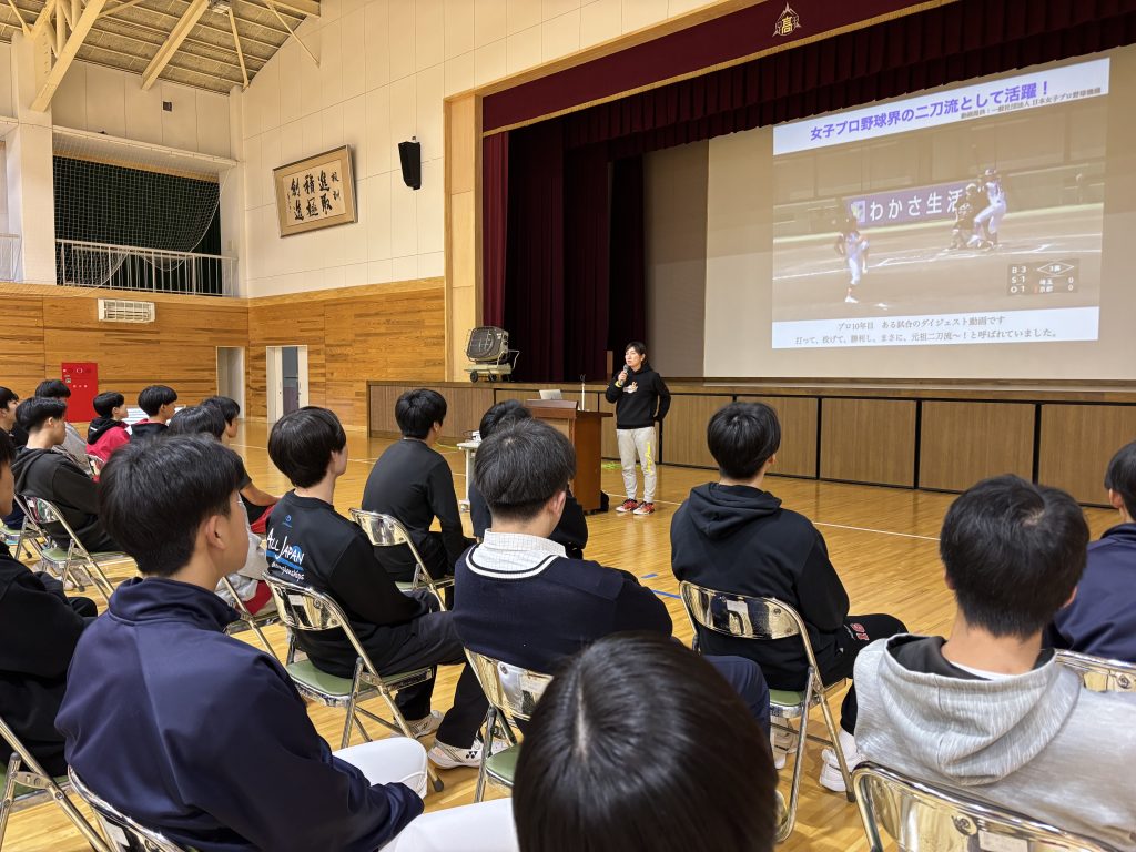 11月28日(金)、アスリート派遣事業として、元女子プロ野球選手の小西美加氏お招きし、スポーツ専攻の生徒全員を対象に講義と実技指導をしていただきました。講義では、野球を広く知ってほしいという思いや、自分のしたいスポーツができている今が幸せであるということを教えていただきました。実技指導では、硬式野球部を対象にウォーミングアップの仕方やスローイングのコツ、打撃強化などを教えていただきました。一つひとつ丁寧にアドバイスをいただき、短時間で技術力が上がっていく姿が見られ、生徒たちにも自然と笑顔があふれる時間となりました。小西氏に教えていただいたことを胸にこれからも日々努力していきます。