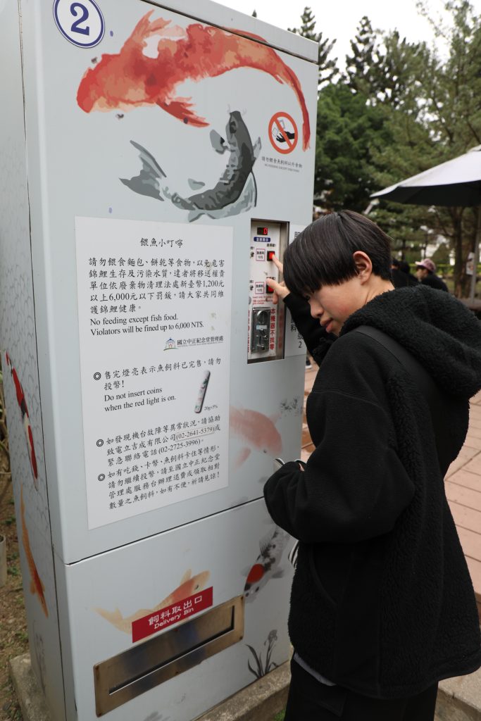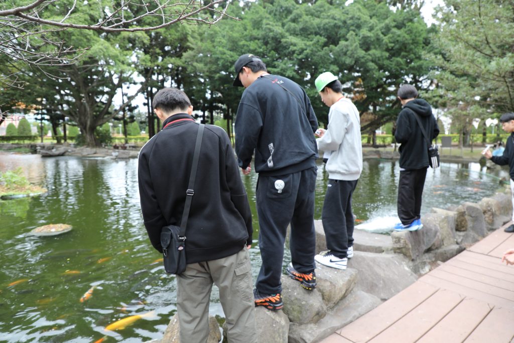 池のコイにあげる餌を売っていました。皆でコイに餌をあげています。