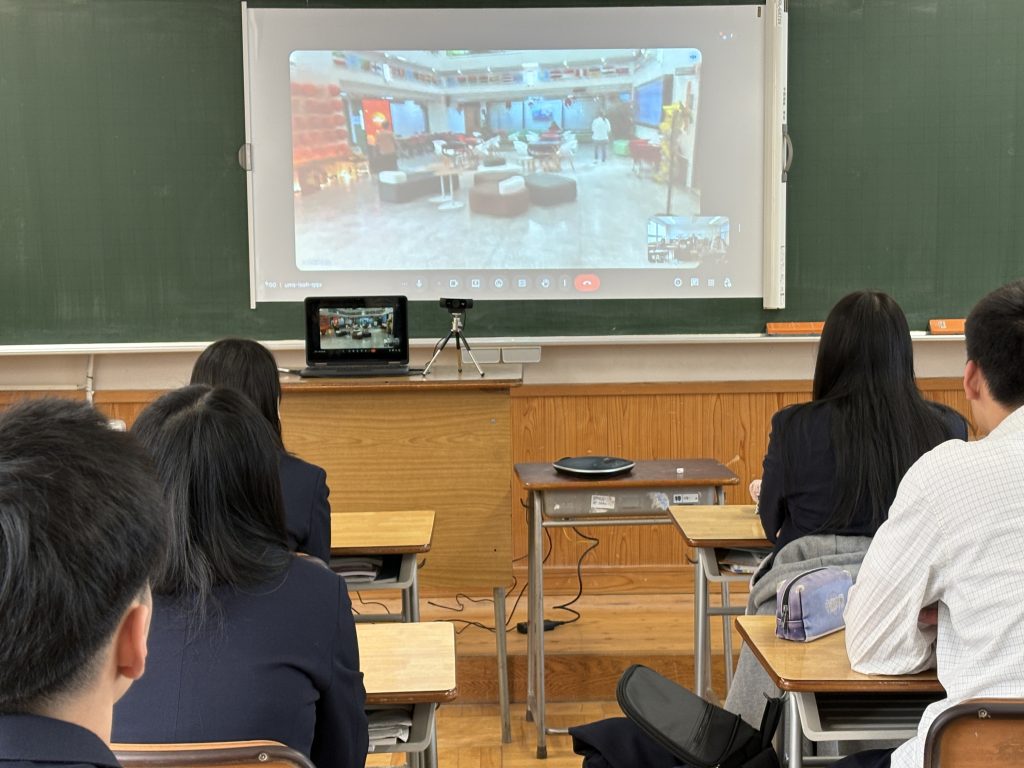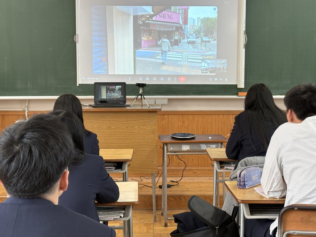 台湾師範大学の寮や語学研修センター、そして、大学の周りのカフェや銀行、スーパーマーケットについて台湾で語学研修中の2年生や引率している先生方から説明を受けました。1年生からは「授業はどのように行われていますか。」や「台湾で美味しかった食べ物は何ですか。」等といった質問も飛び出しました。