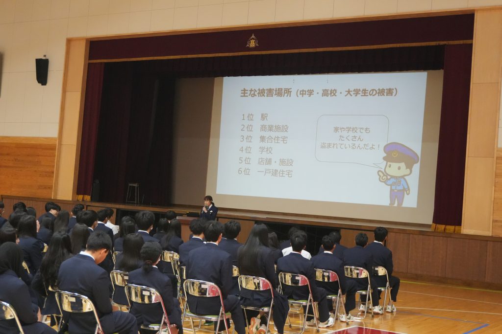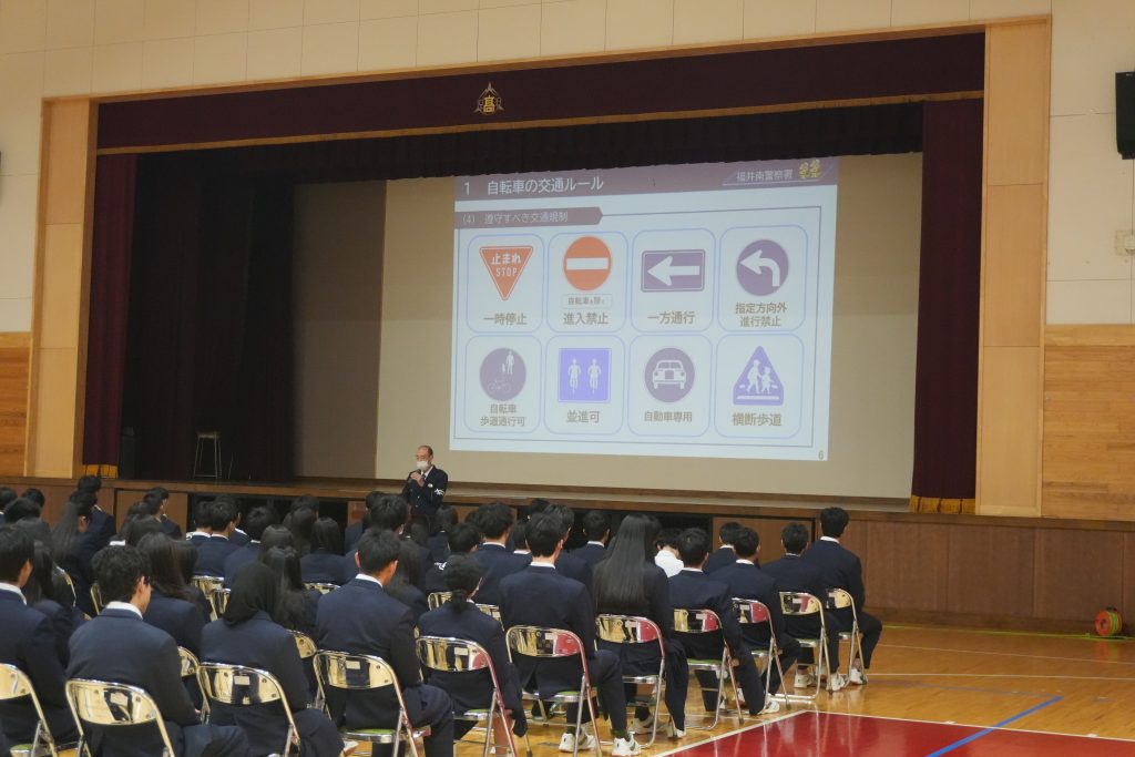 3月11日(水)、福井南警察署の方をお招きし、道路交通法改正に伴う交通安全講話を行いました。 4月から、16歳以上を対象に「青切符」の適用が始まることを受け、具体的な違反例や新ルールについて詳しく解説していただきました。改正を間近に控え、生徒たちにとっては自身の交通マナーを改めて見つめ直す非常に貴重な機会となりました。